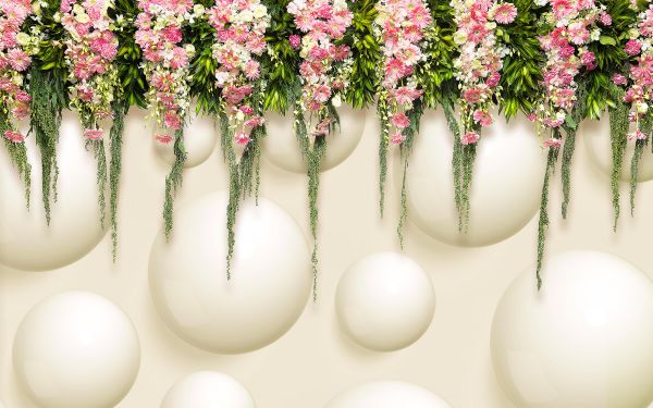 Hangende roze bloemen over 3D muur in different materials