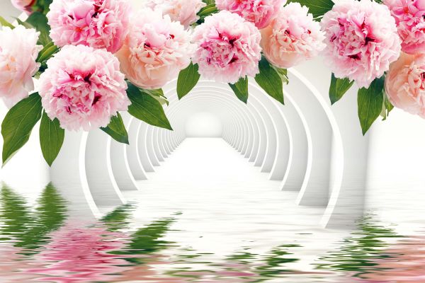 Tunnel met pioenrozen in verschillende materialen